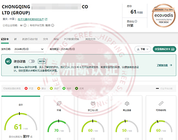 重庆***科技股份有限公司顺利通过EcoVadis评估,最终以61/100分获得铜牌勋章