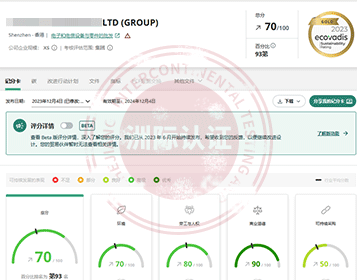 深圳***电子有限公司顺利通过EcoVadis评估,最终以70/100分获得金牌勋章