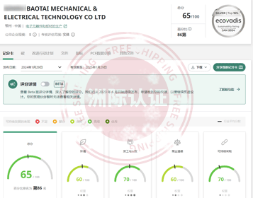 鄂州**机电科技有限公司顺利通过EcoVadis评估,最终以65/100分获得银牌勋章